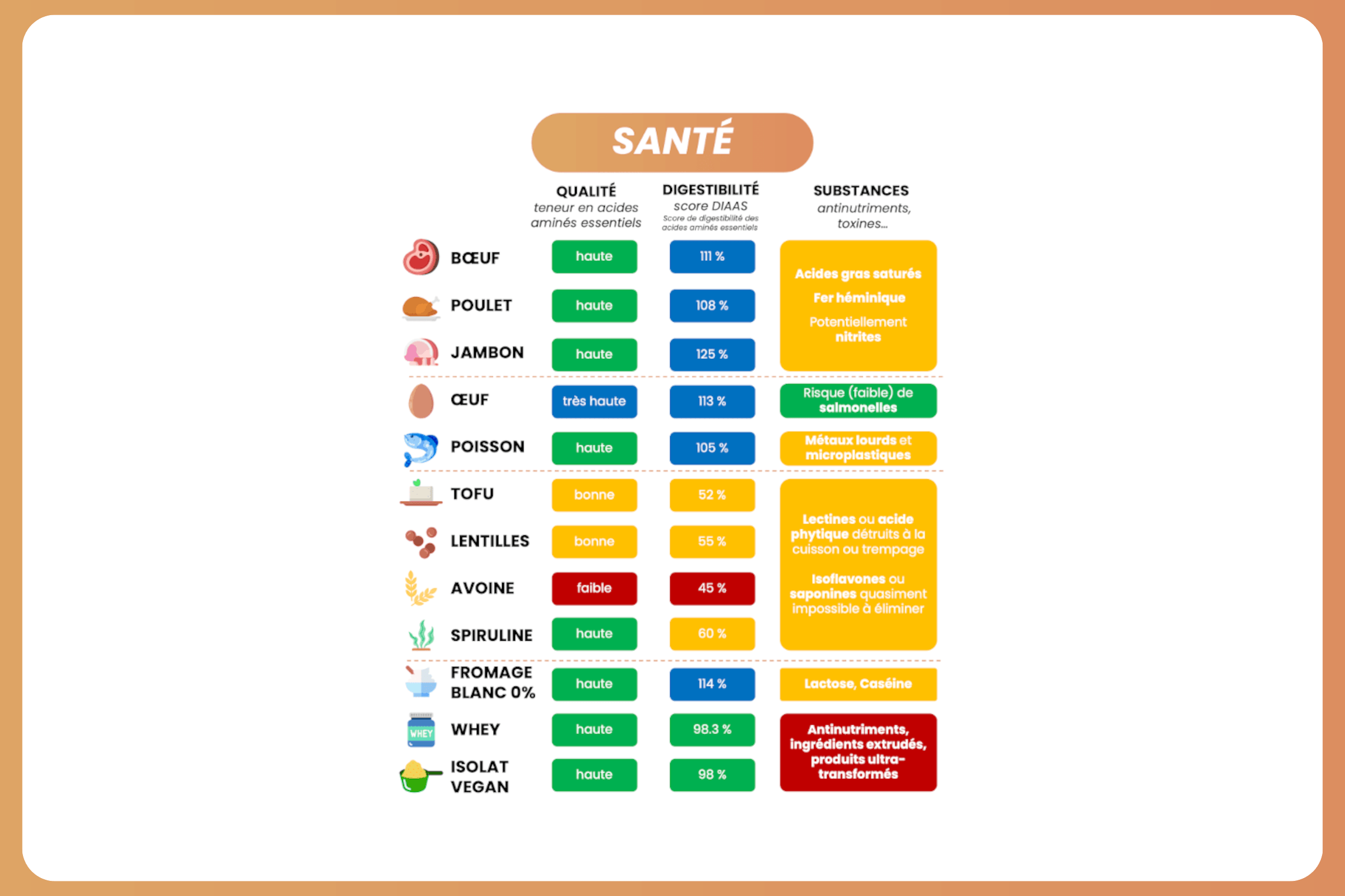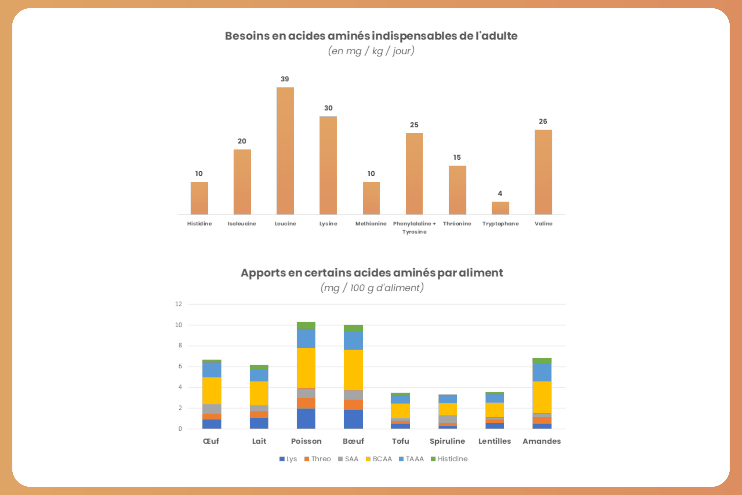 La quantité de protéines dans les aliments ne fait pas tout. Il faut en effet s’intéresser à la quantité d’acides aminés essentiels contenu dans l’aliment et leur digestibilité. Les protéines animales et végétales ont toutes des acides aminés essentiels, mais leur quantité et leur combinaison peuvent varier. Les acides aminés essentiels sont ceux qui ne peuvent pas être produits par l’organisme et doivent être obtenus par l’alimentation. Il y a 9 acides aminés essentiels : lysine, phénylalanine, valine, thréonine, tryptophane, méthionine, histidine, leucine et isoleucine.