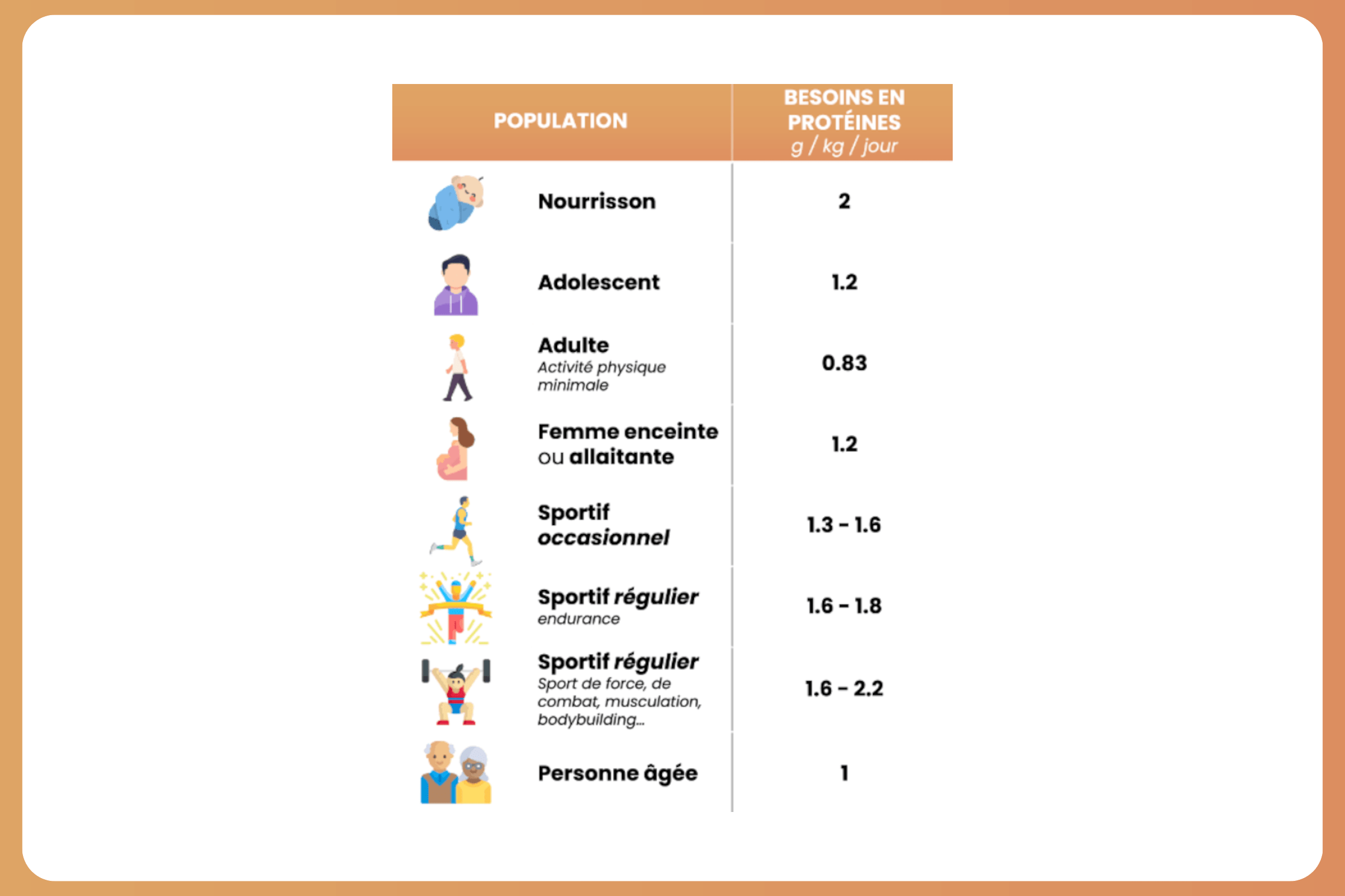 Important : ces recommandations sont des moyennes et les besoins en protéines peuvent varier en fonction de facteurs tels que l’activité physique et les objectifs de santé spécifiques. Il est recommandé de consulter un professionnel de la santé qualifié pour connaitre ses propres besoins nutritionnels en fonction de sa propre activité et santé globale (diététicien.nne ou médecin nutritionniste).
