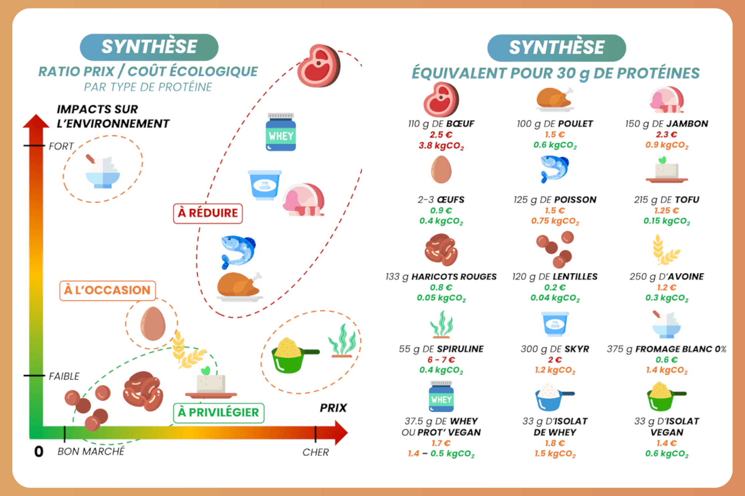 Et, en dernier visuel de synthèse, nous avons mis ces impacts en relation avec la quantité réelle de protéines. Tu y retrouves ainsi l’émission de CO2eq / kg de protéines.