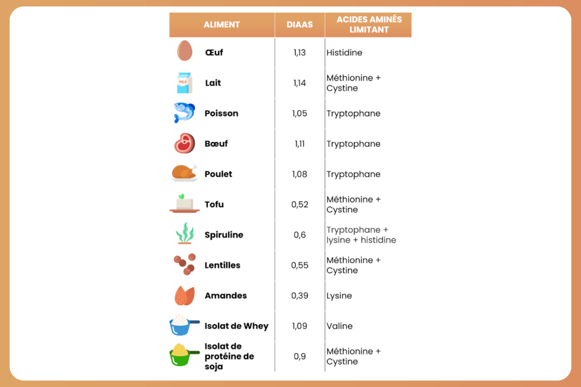 - Le DIAAS, quant à lui, est une méthode qui mesure la quantité d’acides aminés essentiels qui sont absorbés par l’organisme et qui sont disponibles pour la synthèse des protéines. Il est également exprimé sur une échelle de 0 à 1, avec une valeur de 1 étant la meilleure.